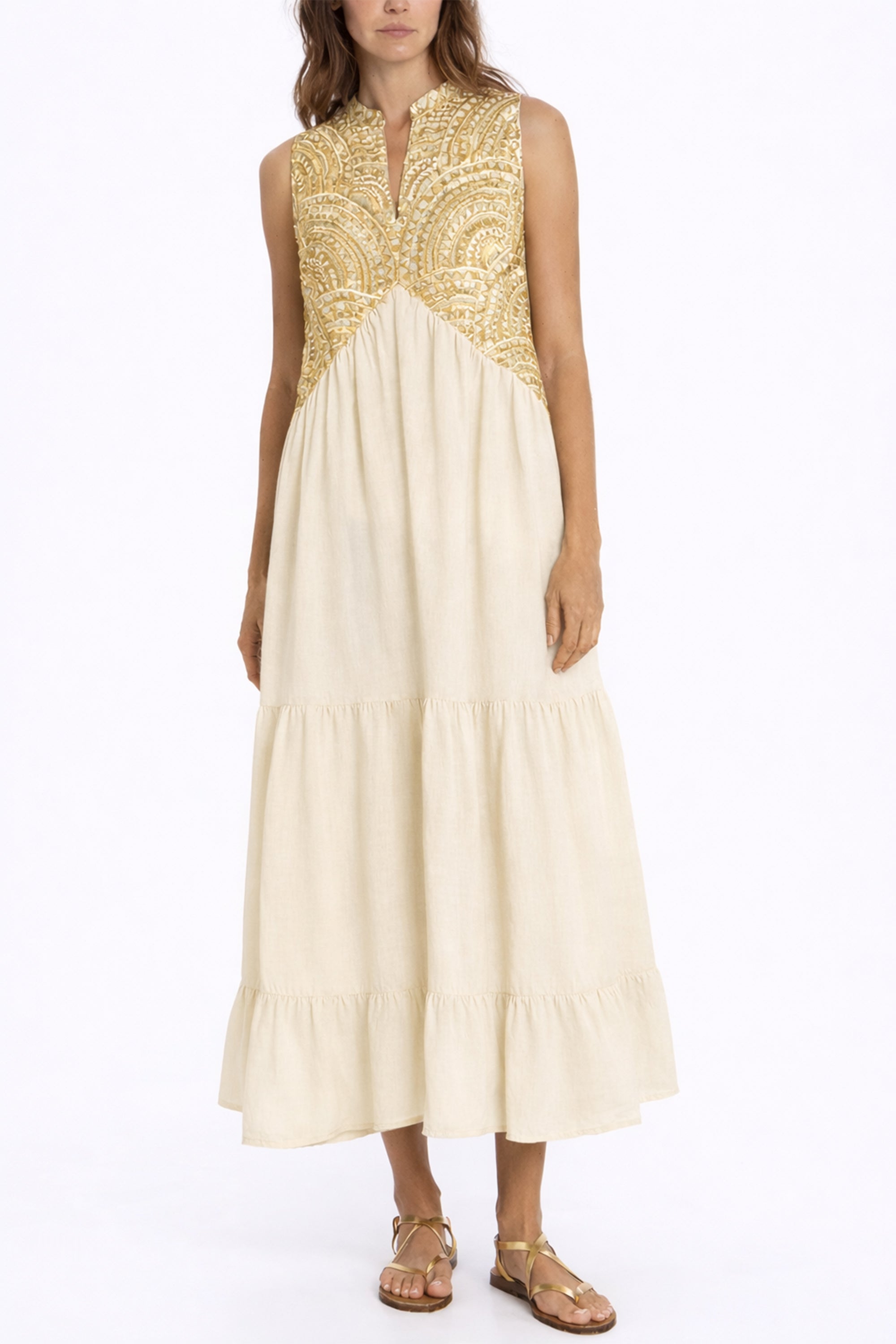 LONG SLEEVELESS COTTON DRESS "TRIANGLE" NATURAL/GOLD