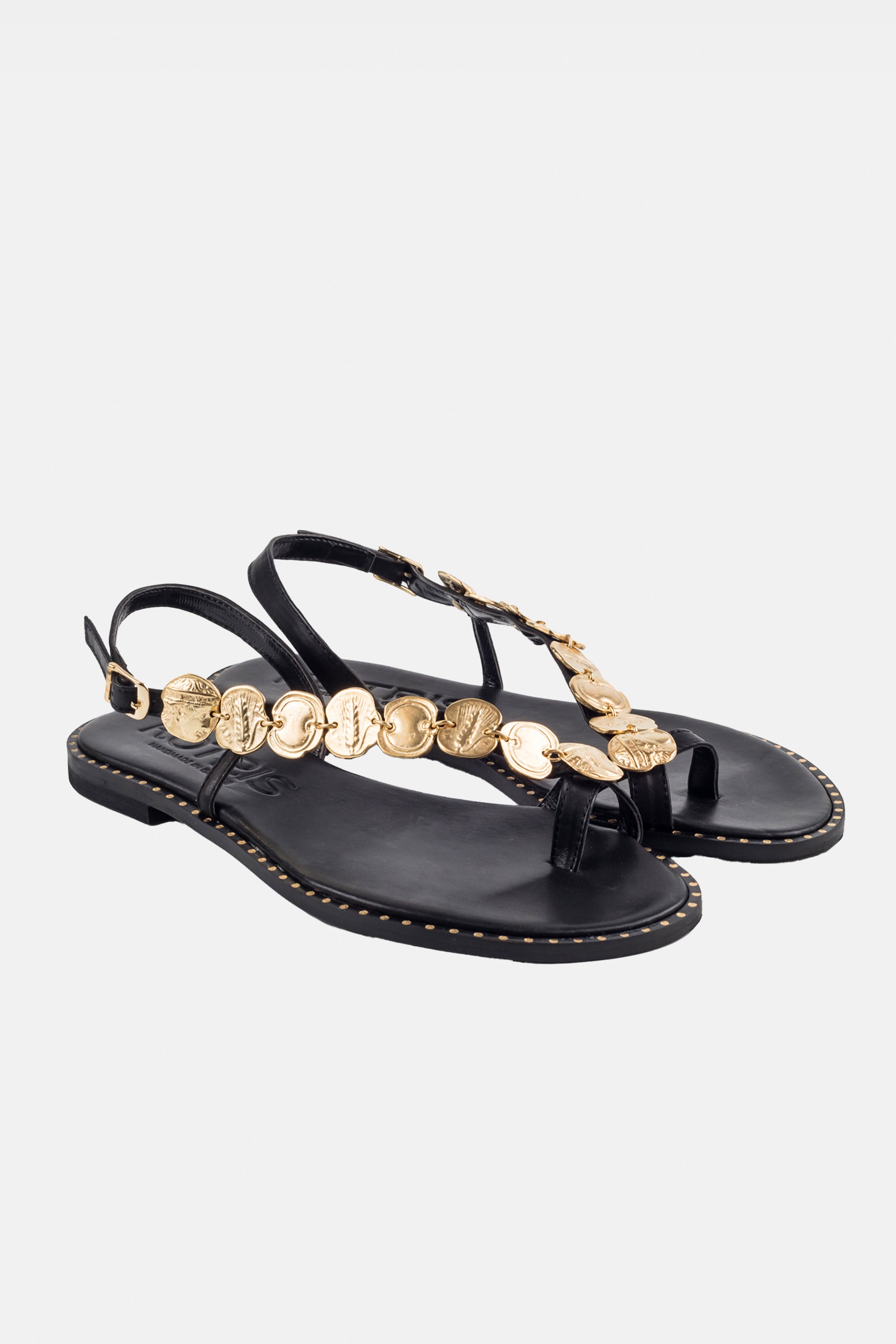 Mit den wunderbar edlen, matt Gold glänzenden Verzierungen, die antiken Münzen nachempfunden sind, sind diese schönen Sandalen wirklich ein Upgrade für jedes Outfit.