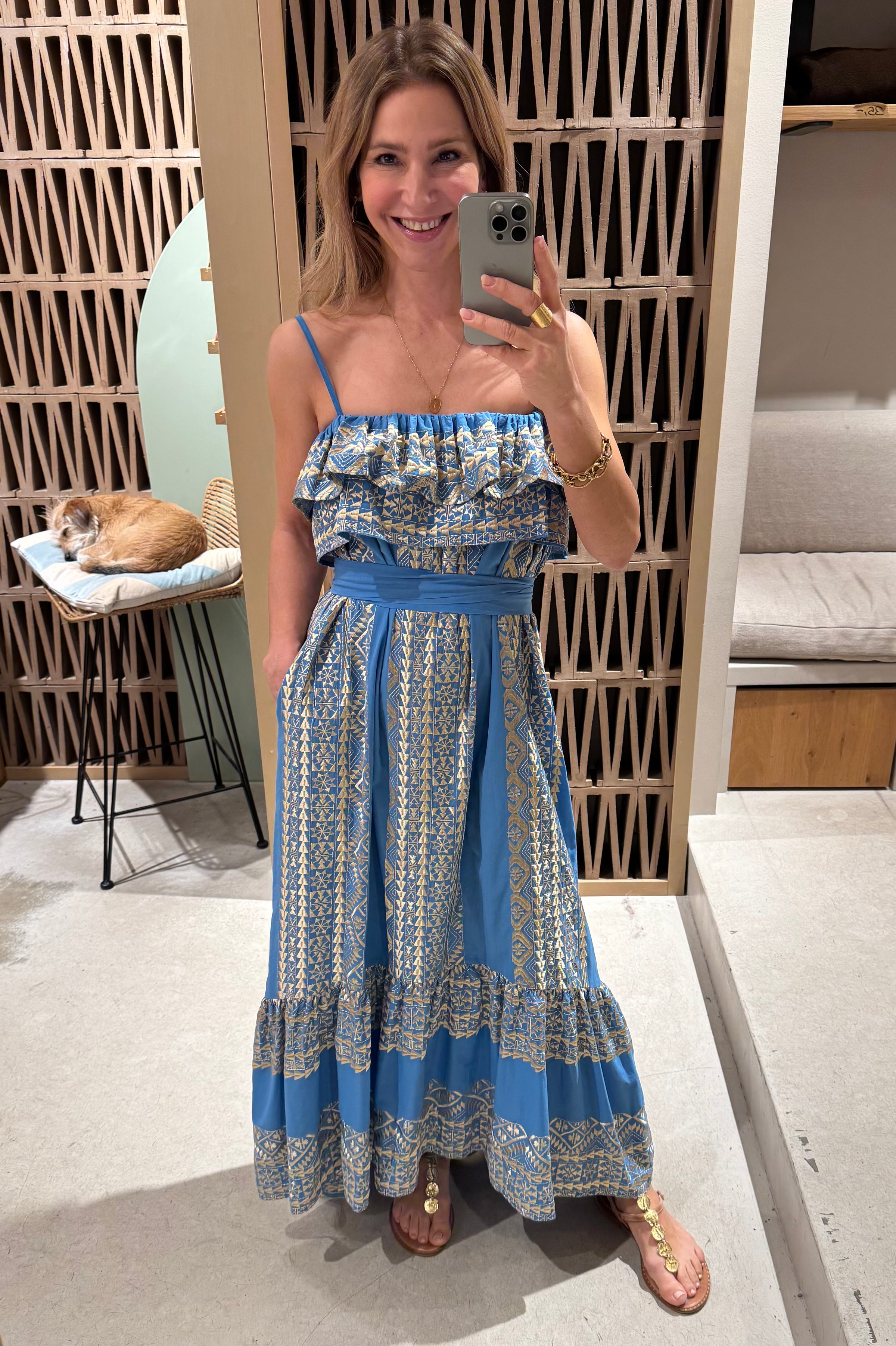 STRAPPY MIDI COTTON DRESS WITH RUFFLES "EMBROIDERED" BLUE RAF/GOLD