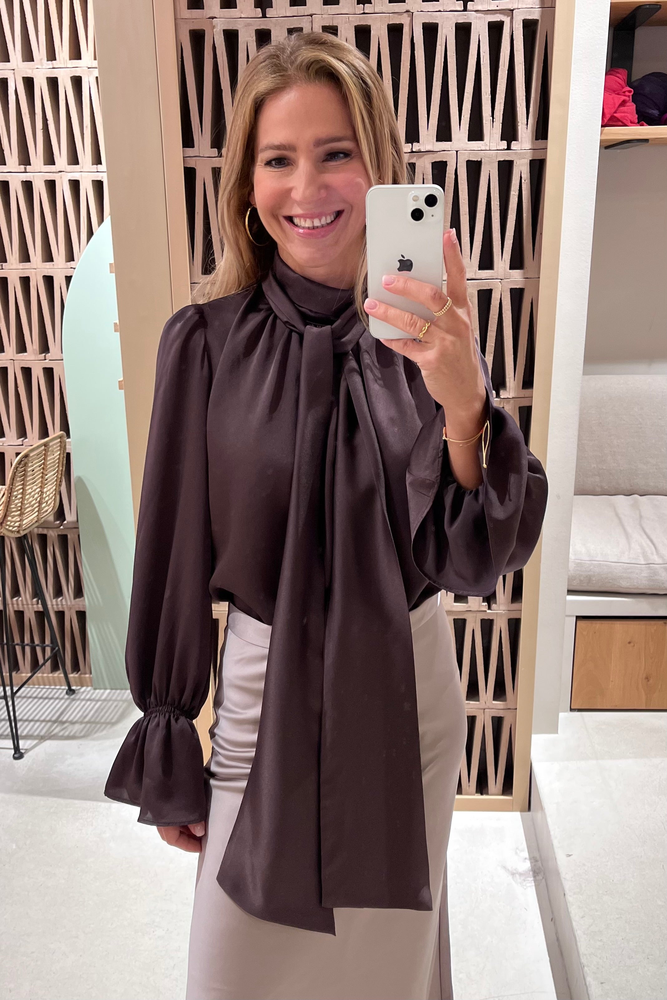 SILKY SATIN BOW TIE BLOUSE "CHLOE" BROWN