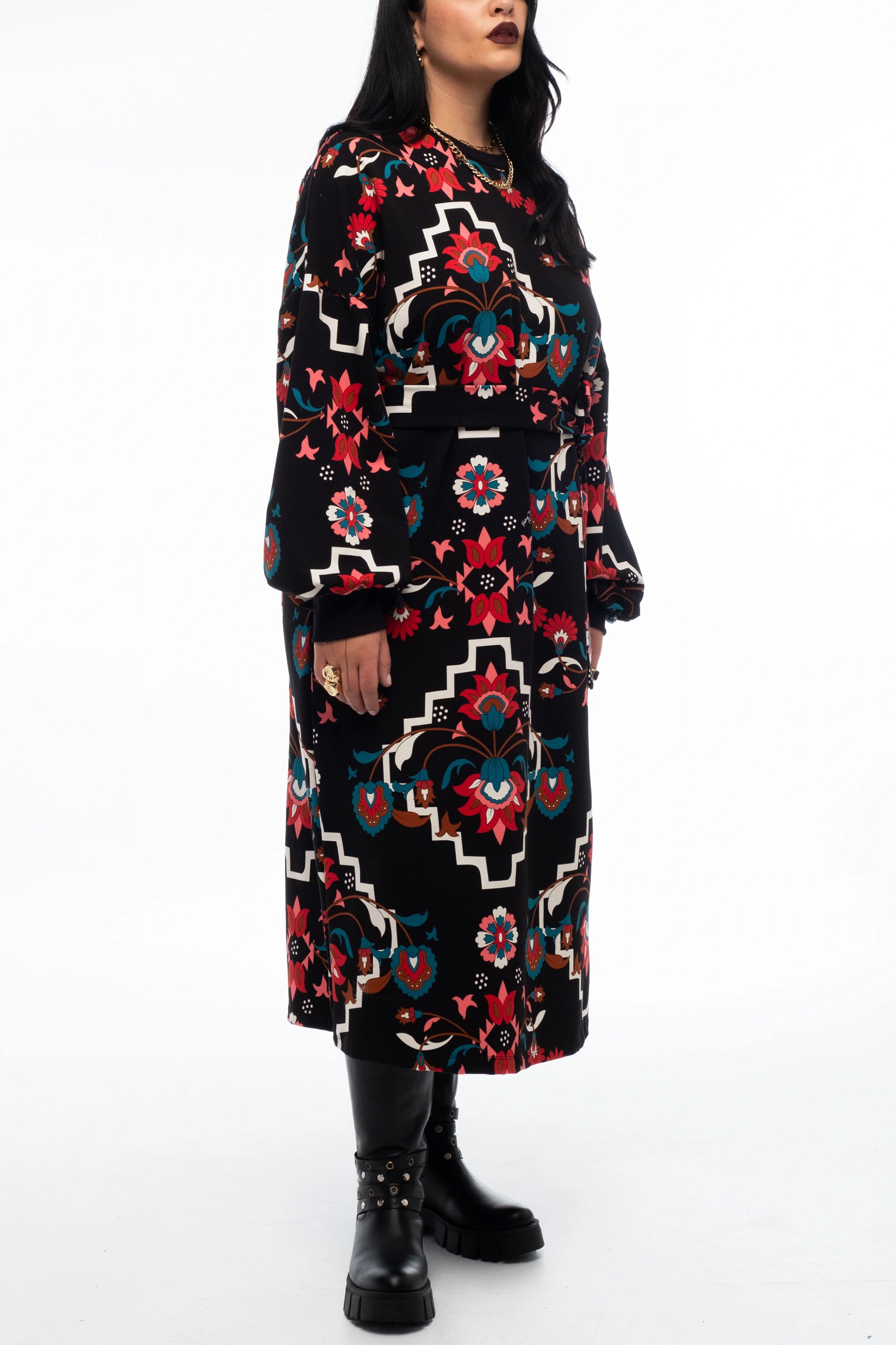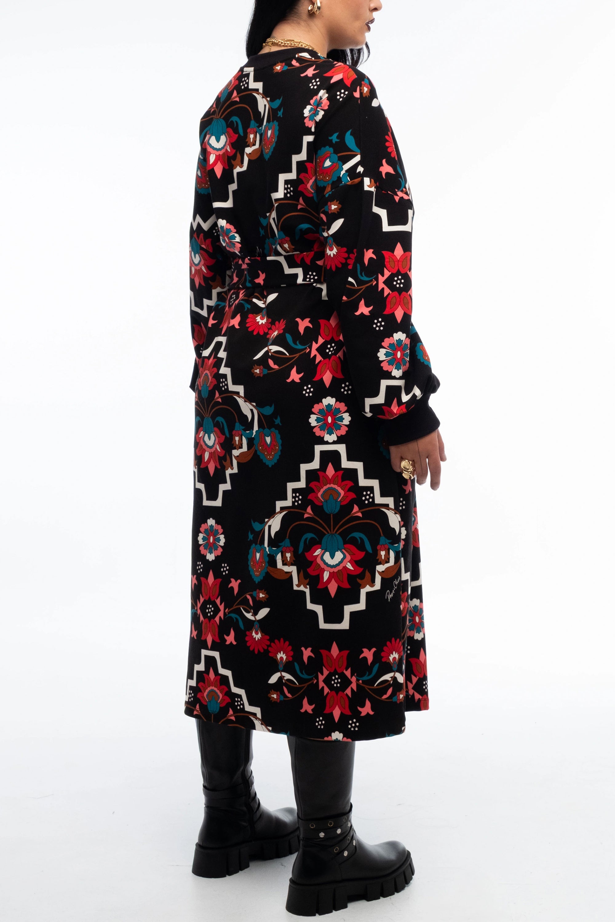 MIDI COTTON SWEATER DRESS WITH FLOWER PRINT BLACK/MULTI
