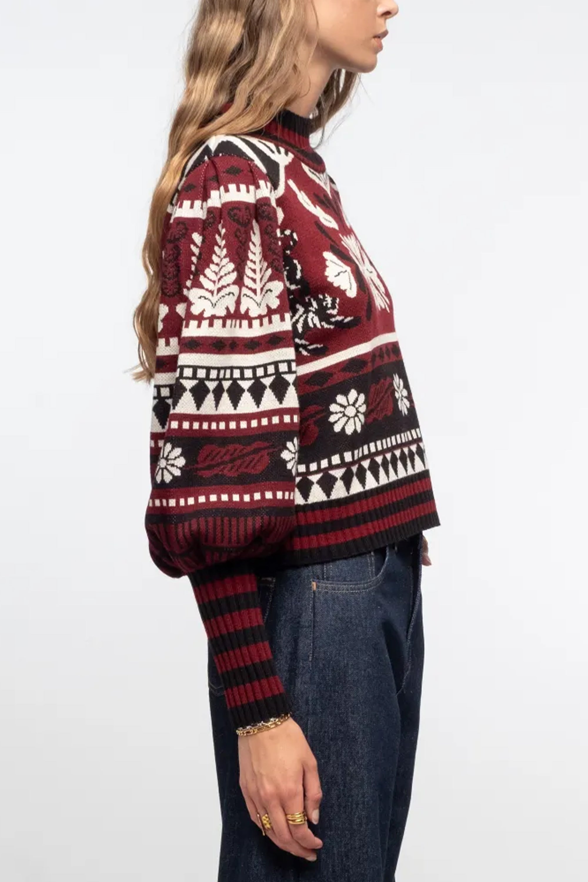 INTARSIA KNIT PULLOVER BLACK/ECRU/BORDEAUX